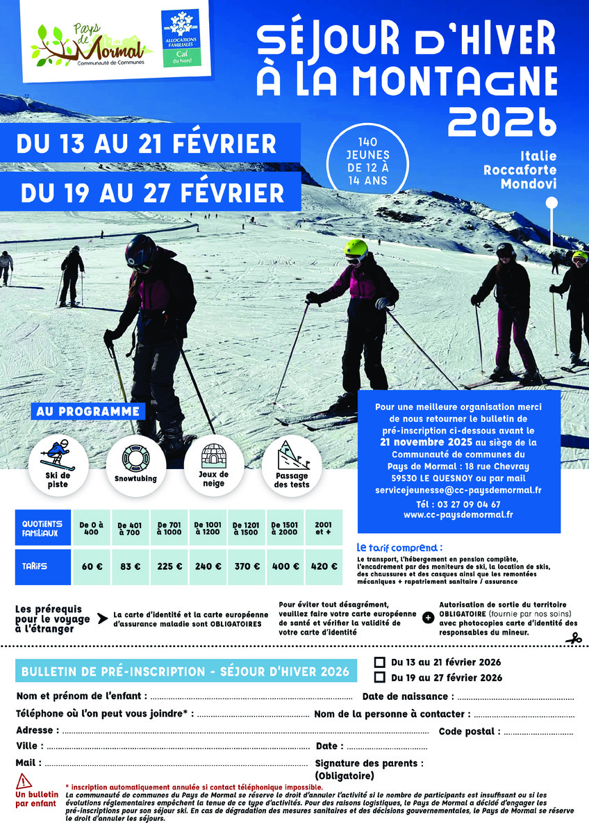 Attention, le formulaire de pré-inscription est à retourner avant le 21 novembre 2025 au siège de la Communauté de Communes, au 18 rue Chevray 59530 LE QUESNOY, ou par mail à servicejeunesse@cc-paysdemormal.fr