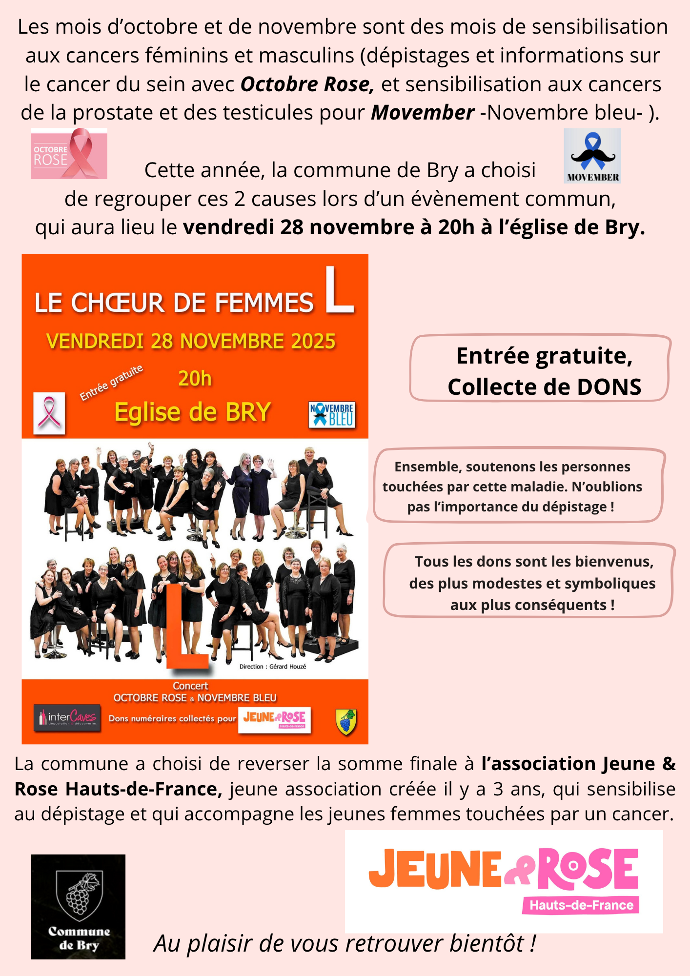 Cette année la commune de Bry a choisi de regrouper ces 2 causes lors d'un évènement commun, qui aura lieu le vendredi 28 novembre 2025 à 20h à l'église Saint Laurent de Bry.