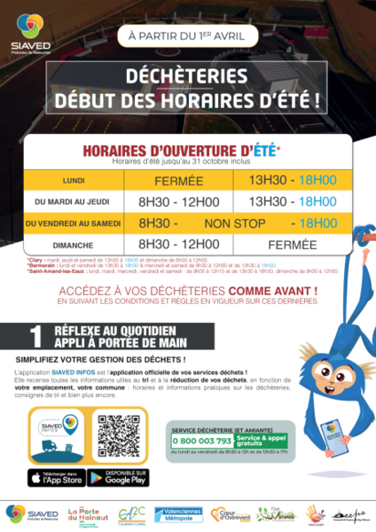Le SIAVED vous informe que les déchèteries du SIAVED passent aux horaires d'été à partir du mercredi 1er avril 2026 :