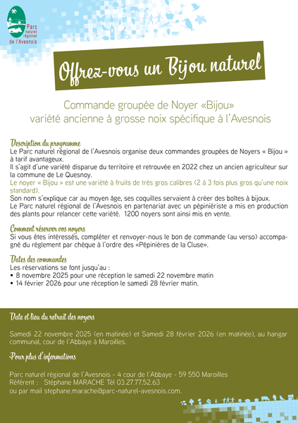 Cette année, l'opération Plantons le décor est complétée par une action du Parc Naturel Régional qui permet de commander des noyers « Bijou », variété ancienne à très grosses noix, spécifique de l’Avesnois.
