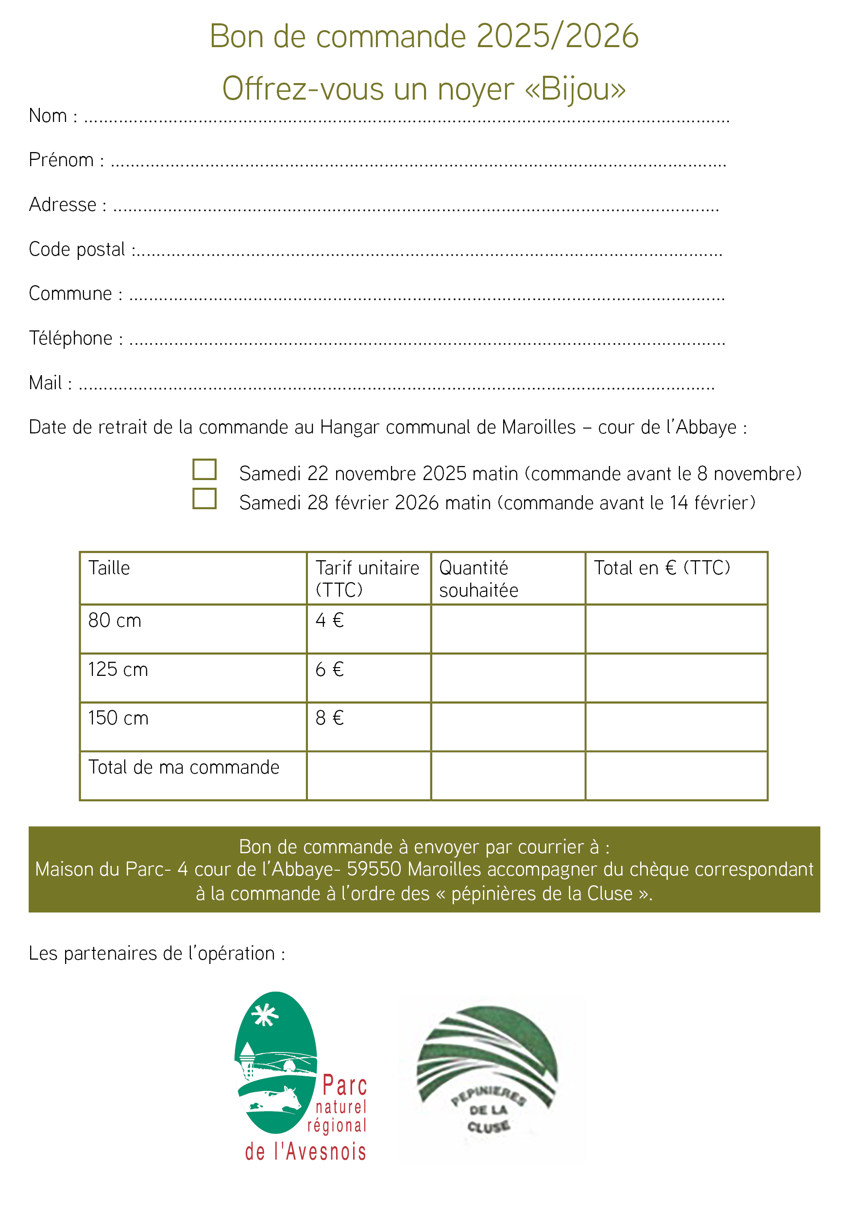 Vous trouverez les bons de commande sur le site du Parc et ci-dessous, et ils sont à renvoyer par courrier à : Maison du Parc- 4 cour de l'abbaye- 59550 Maroilles, accompagnés du chèque correspondant à la commande à l'ordre des "Pépinières de la Cluse".