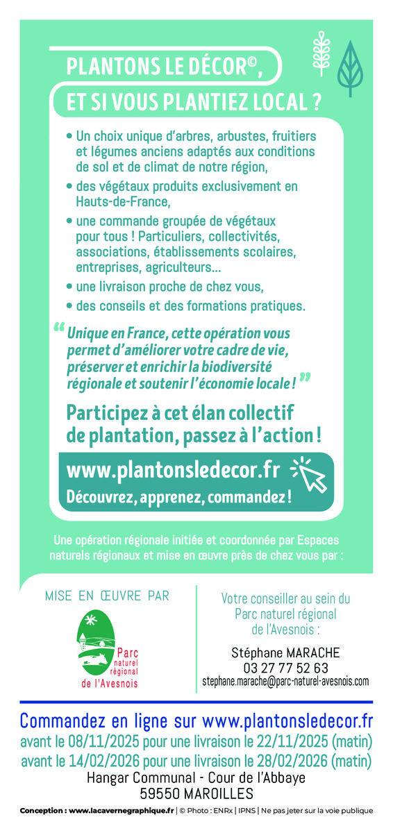 Pour plus d'informations, vous pouvez contacter Stéphane Marache, conseiller en plantations au 03.27.77.52.63 ou par mail à stephane.marache@parc-naturel-avenois.com