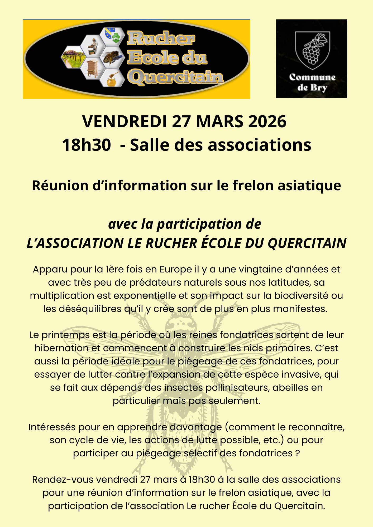 VENDREDI 27 MARS 2026, à 18h30 salle des associations, réunion d'information sur le frelon asiatique