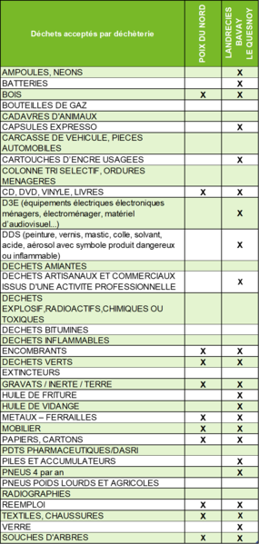 Vous trouverez ci-dessous le tableau récapitulatif des déchets acceptés dans les déchetteries du Pays de Mormal :